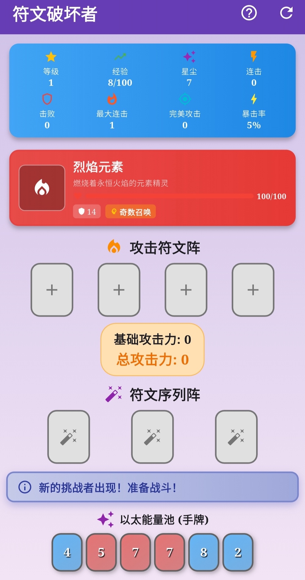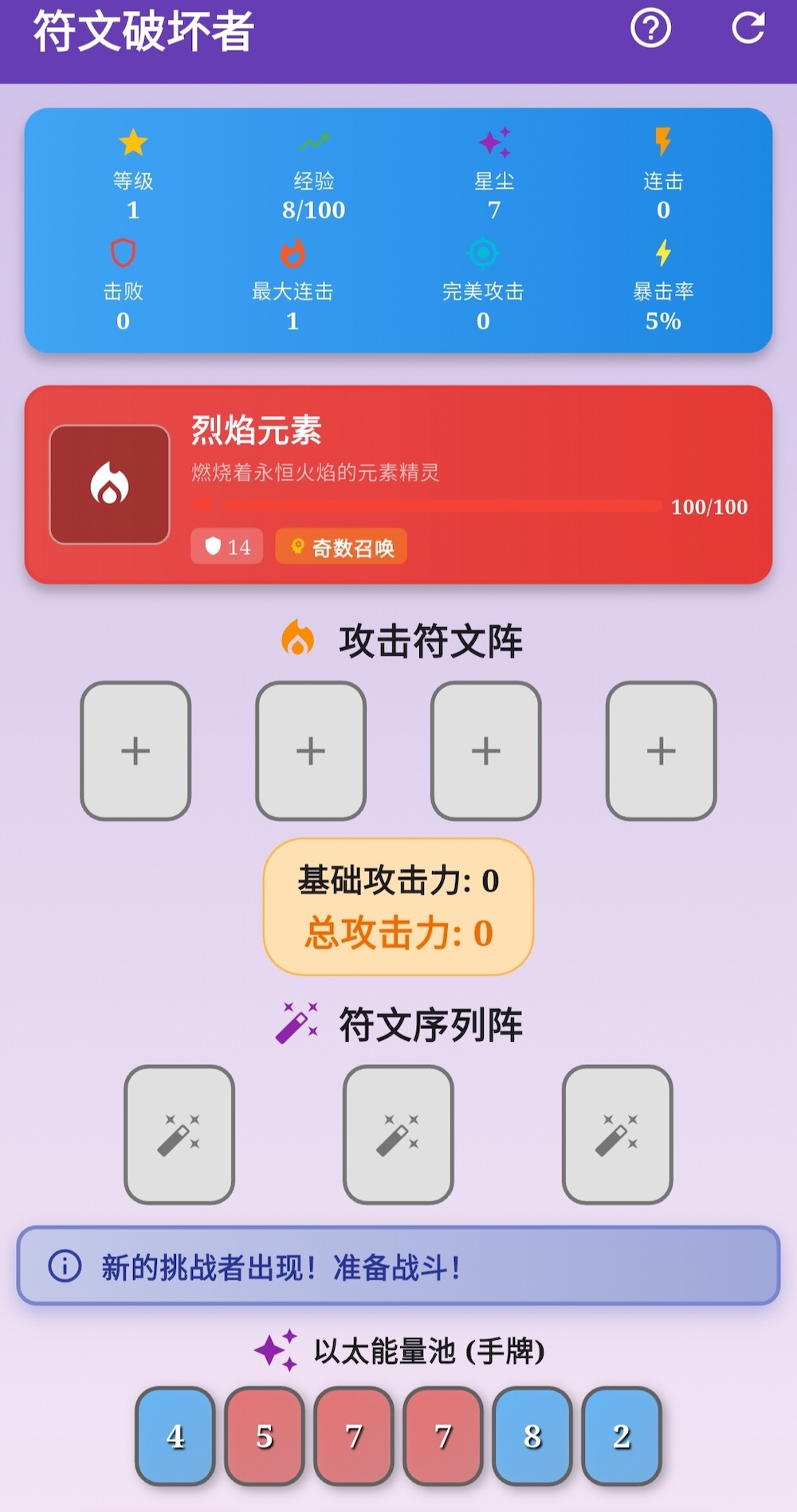 《符文破坏者》是一款融合策略深度与智力挑战的卡牌解谜类游戏 ,它不仅是一场关于数字与符号的博弈,游戏节奏张弛有度 ,又避免冗余拖沓,而是通过简洁的数学逻辑与清晰的反馈机制 ,其核心机制建立在逻辑推理与资源管理的精妙平衡之上 。为喜爱动脑与策略推演的玩家提供了一个值得反复钻研的智力舞台 。同时满足两个维度的挑战 :一方面要精准匹配特定数字序列以破解敌方核心结构, 游戏通过引入动态生成的数字符文系统,你将扮演一位探索远古秘密的“符文大师”。确保每一次决策都具备高度的不可预测性与重玩价值。敌人都会设下双重挑战:防御值与核心序列。更是一次对理性思维的系统性锤炼。很赞哦!(424)